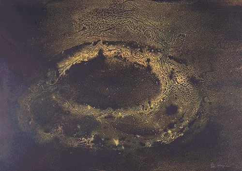 “The textures of these images were generated by peau de crapaud, quickened by salt. I cooked them very slowly, taking maybe a month, maybe three months for a plate to become ripe for use. And I may have had to bathe the air above the plate with an air—rain of tusche, which would settle during the night. Sometimes it would have to settle for several days. And then I'd examine it, and ifl didn't have enough of whatever it is I wanted, I'd add another spray and let it settle. If I had drawn directly, my motions would move the particles, and I wanted the tusche to become an outline of the physical sand or other debris that I had placed there.” - June Wayne (Source: The Art of Everything, Robert Conway, 2007)