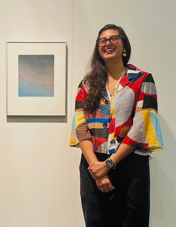 “Radiant Space” curator Sharrissa Iqbal with June Wayne’s “Stellar Edge” State II.