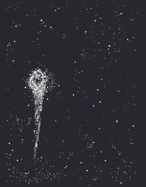 The figure perched on the shaft of light is a reference to the klieg lights at Grauman's Chinese Theater in Hollywood, not far from Wayne's Tamarind Avenue studio. Wayne uses the shaft of light as if it were a solid platform on which a seated figure, shading its eyes, is trying to see where it is. Her penchant for paradox comes through: festivity, isolation, solid-seeming nothingness, a Kafkaesque plotline similar to The Hero or The Ladder. (Source: The Art of Everything, Robert Conway, 2007)