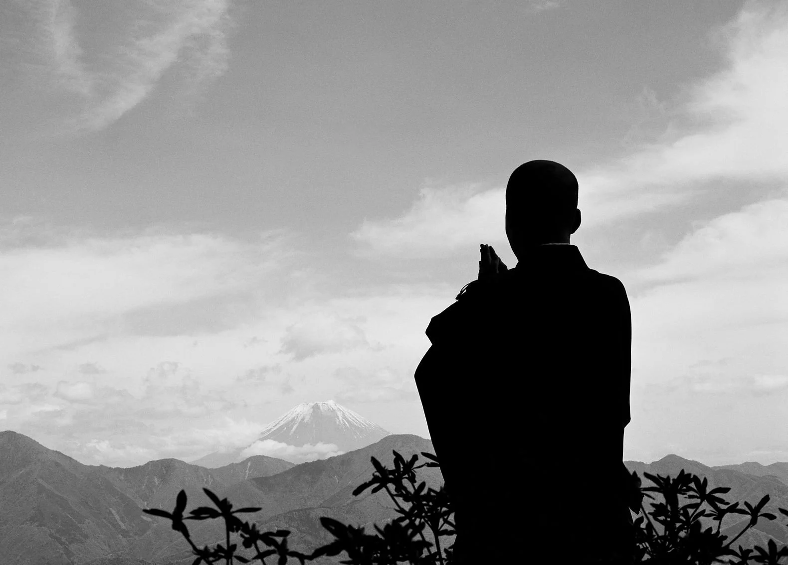 A priest of the Nichiren sect of Mount Minobu pays respect to Mount Fuji, 1992