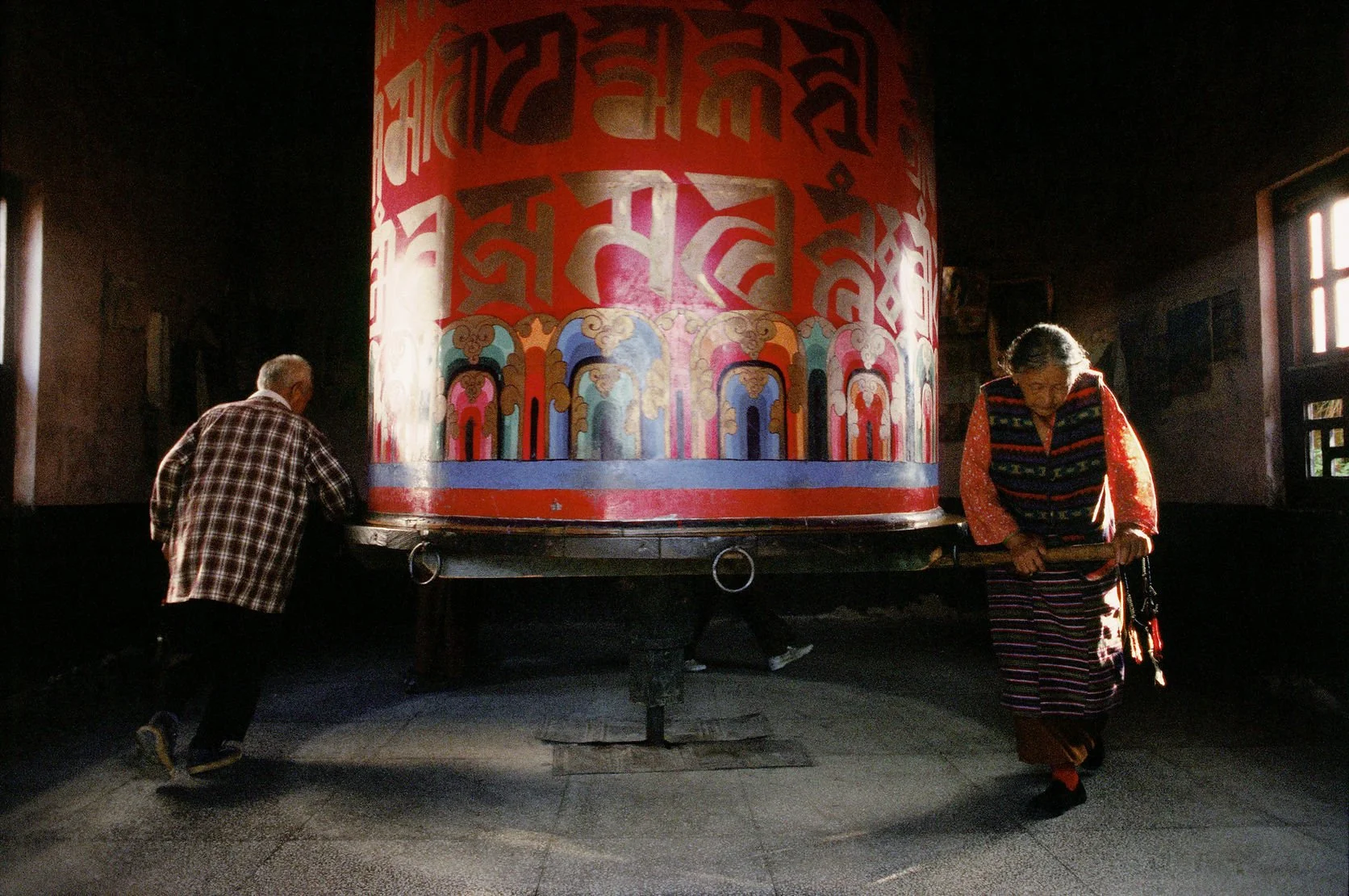 Prayer Wheels with mantra Om Mani Padme Hum embossed on the outside. As the wheel turns and the practitioner recites the mantra silently or out loud, compassion for all sentient beings is generated. Bir, Himachal Pradesh, India, 1997
