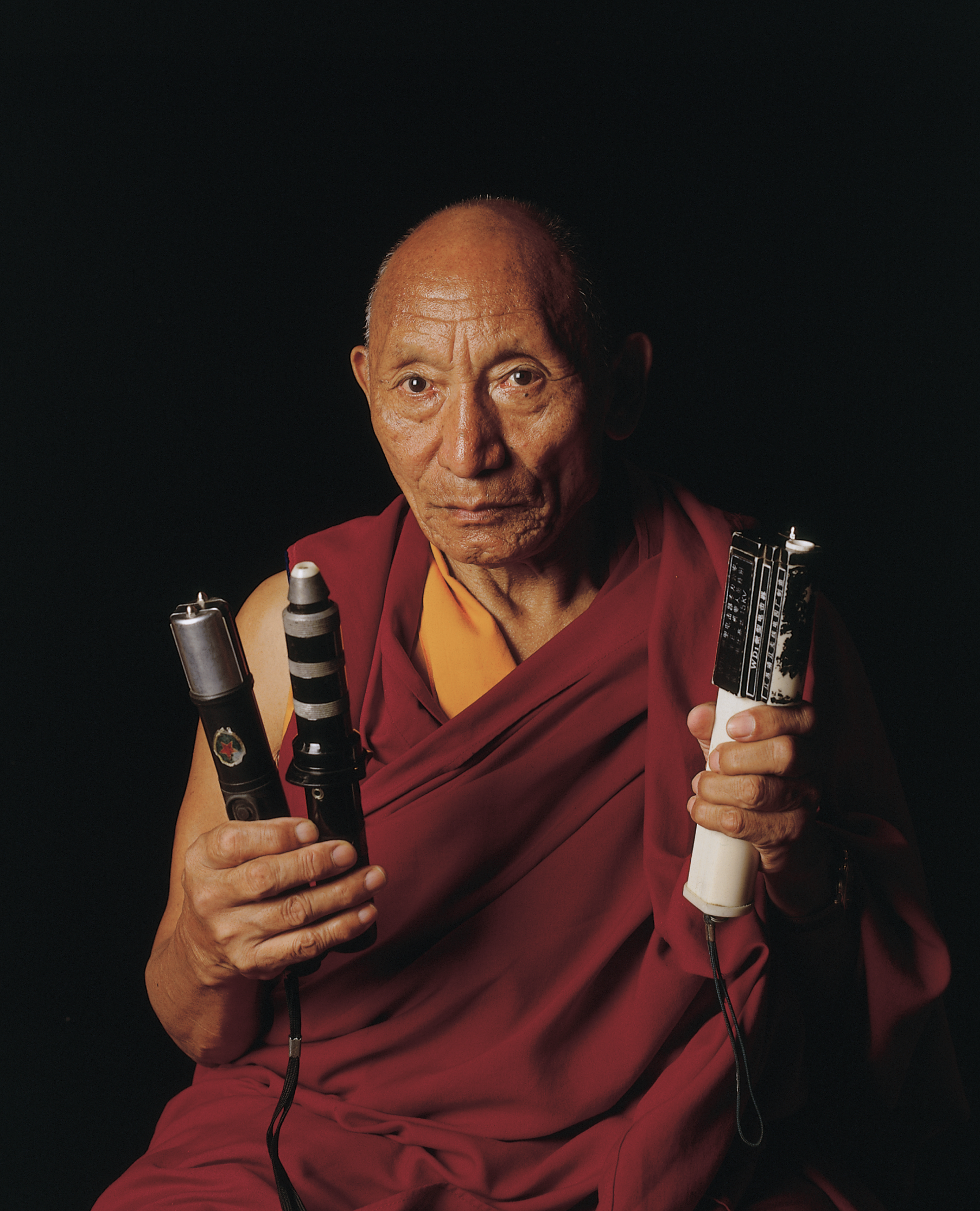 The Venerable Palden Gyatso was imprisoned in Tibet for thirty-three years by the Chinese government for peacefully protesting. He holds torture instruments used in Tibetan prisons, which he smuggled out as witness. Los Angeles, 1998