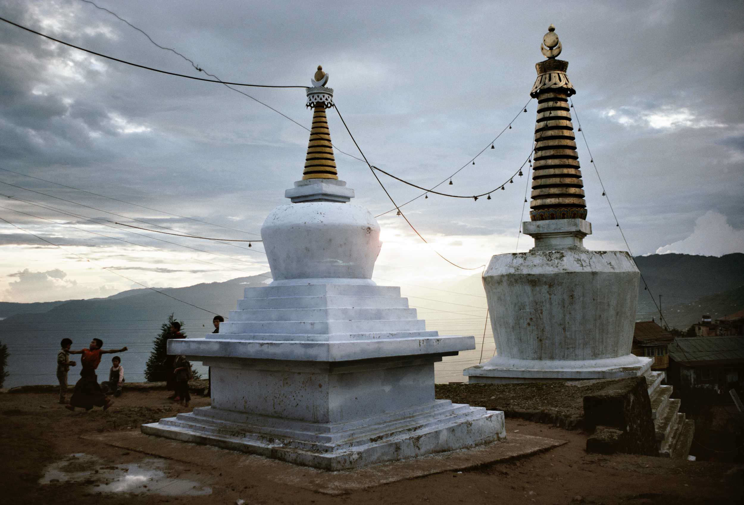 Children playing by the stupas at Sonada Tibet Buddhist Monastery, Darjeeling, India, during the last ten days of the funeral for Kalu Rinpoche