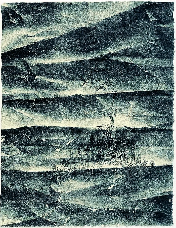 In The Shelf, Wayne sprayed crumpled transfer paper with tusche to create a field suggesting ledges being scaled by lemming-people. Because the buff Arches cover was integral to Thirteenth Memory, this paper was used for the Tamarind impressions, customarily printed on a different stock. (Source: The Art of Everything, Robert Conway, 2007)